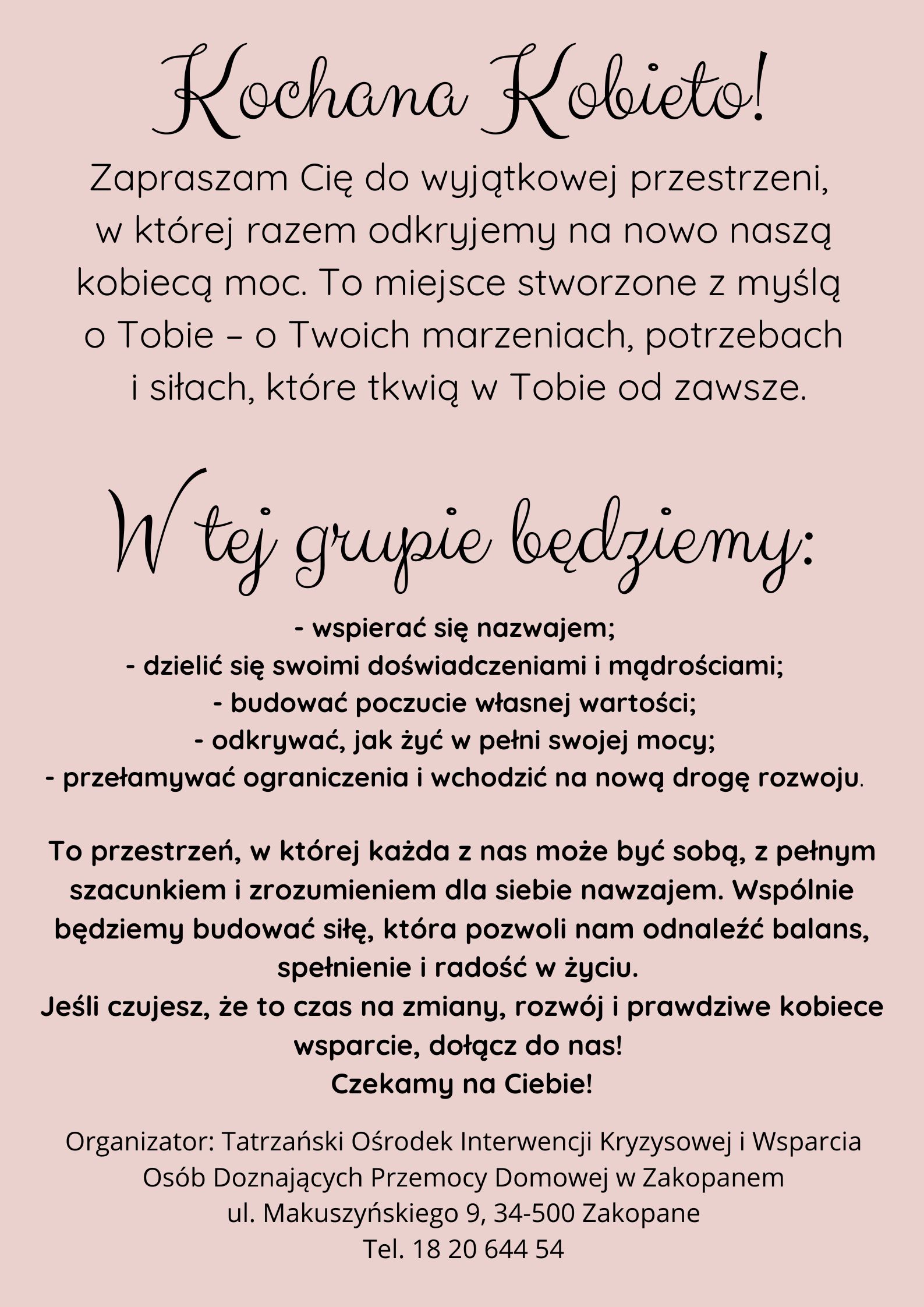 Zapisów można dokonać pod numerem telefonu: 18 20 644 54 lub osobiście w siedzibie Tatrzańskiego Ośrodka Interwencji Kryzysowej i Wsparcia Osób Doznających Przemocy Domowej, przy ul. Makuszyńskiego 9 w Zakopanem.