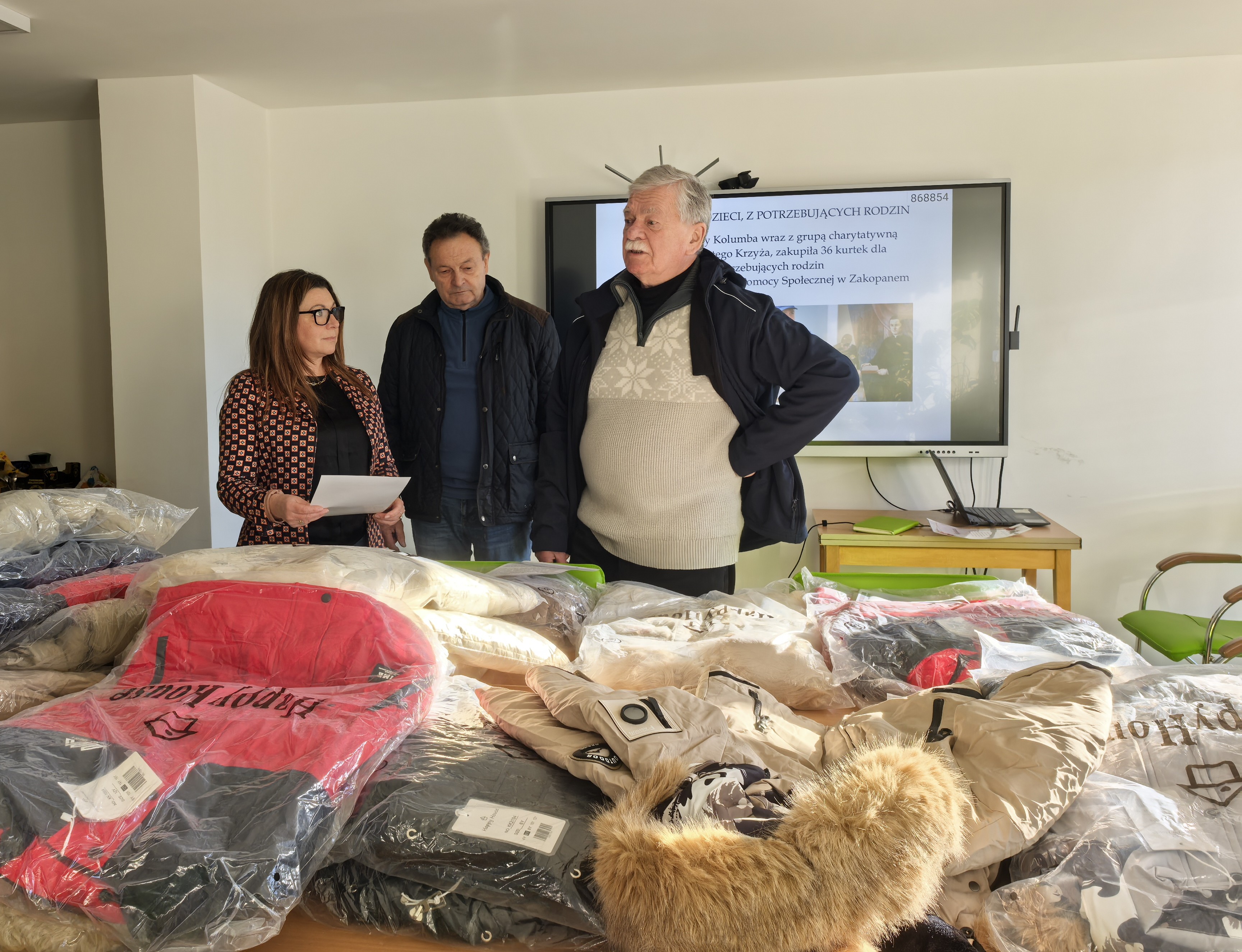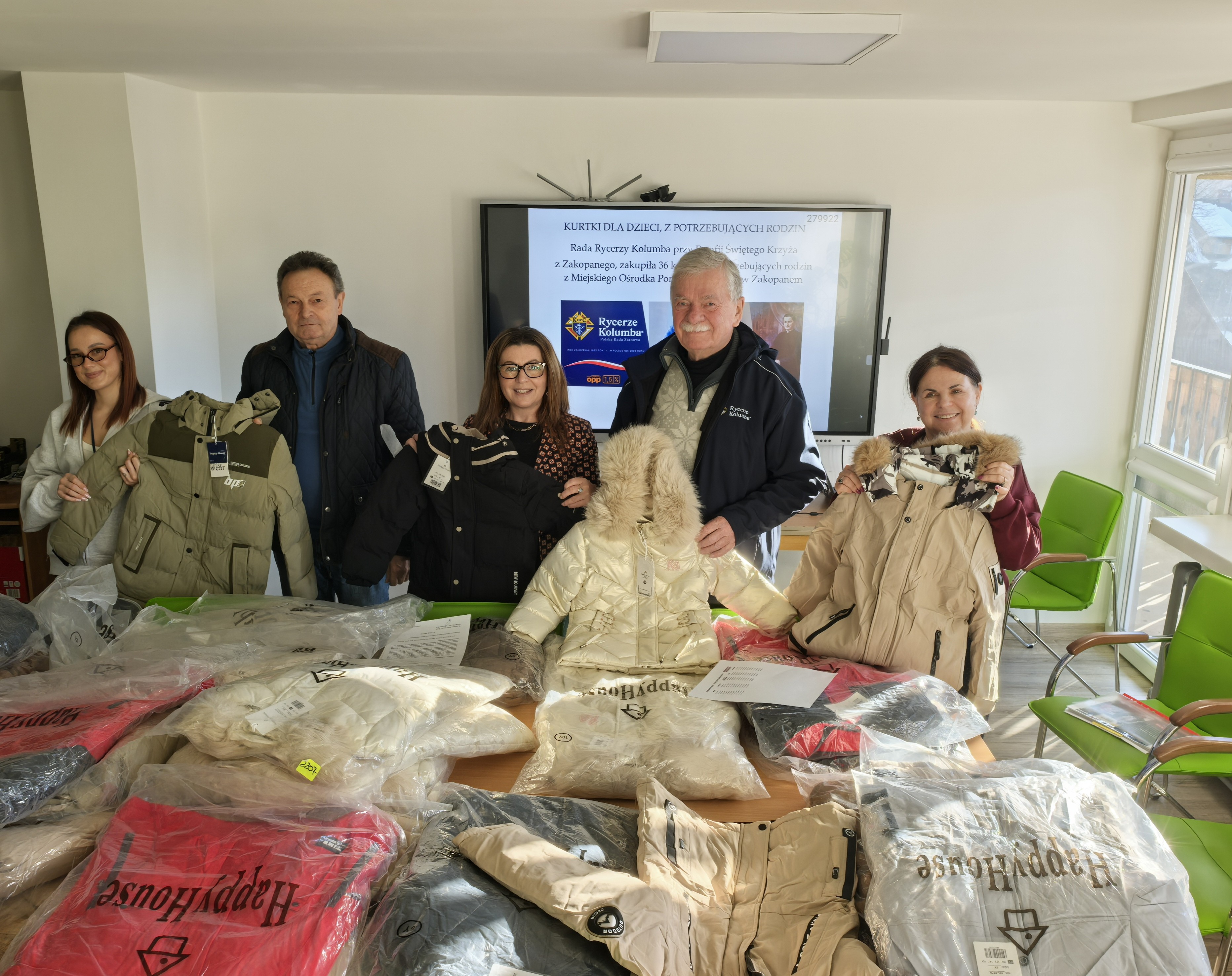 Rycerze Kolumba działający przy Parafii Świętego Krzyża w Zakopanem w dniu dzisiejszym, tj. 02.12.2025 r. przekazali Pani Dyrektor Urszuli Chowaniec - Bombac, 36 ufundowanych i zakupionych nowych kurtek zimowych (15 dla chłopców i 21 dla dziewcząt) przeznaczonych dla dzieci z potrzebujących rodzin z Miejskiego Ośrodka Pomocy Społecznej. Darczyńcy są przekonani, że ten mikołajkowy prezent spowoduje, że obdarowane dzieci nie będą marznąć.