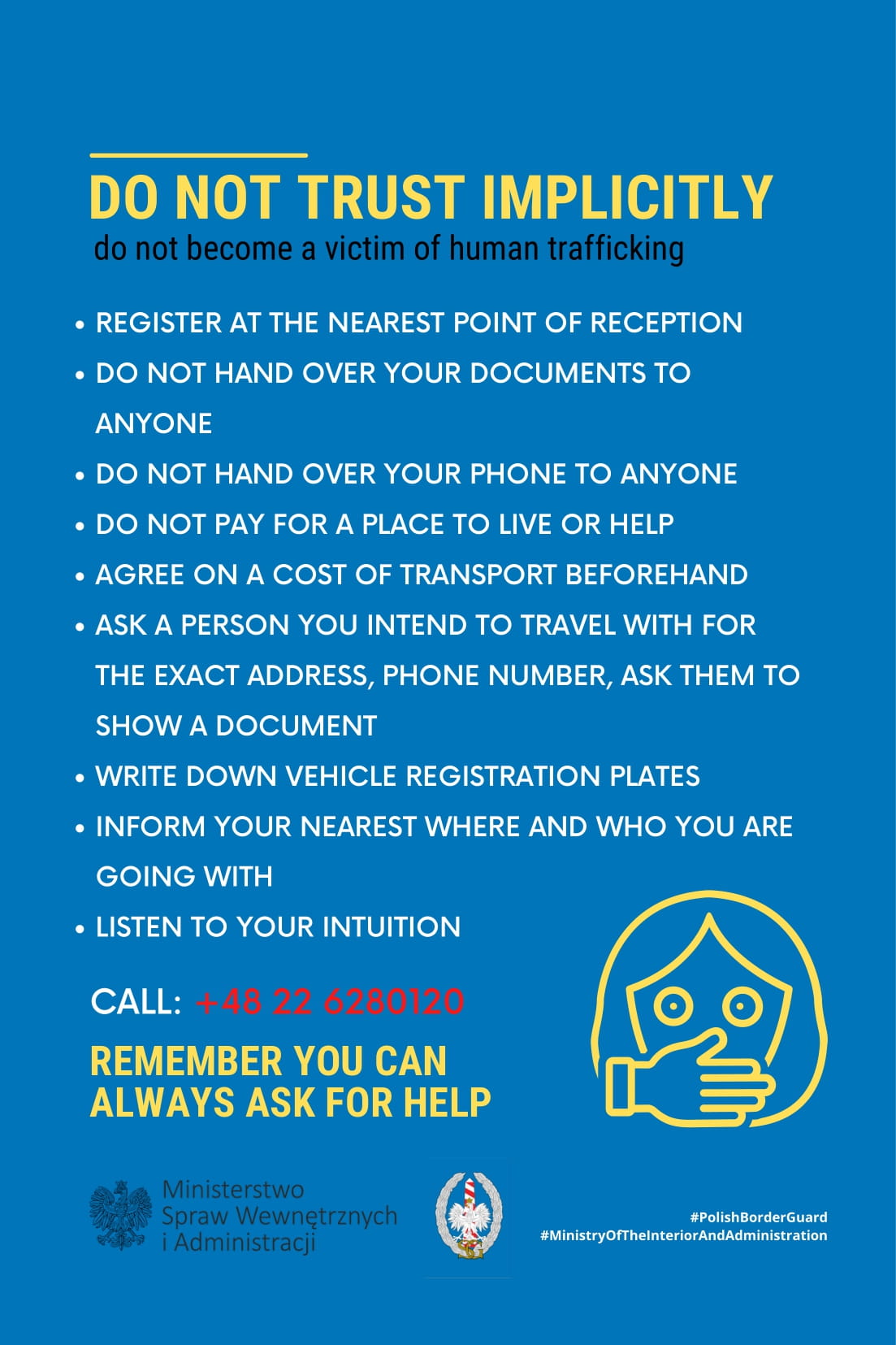 W związku z powyższym Biuro Prezydialne Komendy Głównej Straży Granicznej i Departament Spraw Międzynarodowych i Migracji MSWiA wspólnie opracowali merytorycznie i graficznie ulotkę skierowaną do obywateli Ukrainy przekraczających granicę polsko-ukraińską. W przypadku jakiegokolwiek podejrzenia handlu ludźmi - obywatele Ukrainy, jak również wszystkich innych państw mogą prosić o pomoc Krajowe Centrum Informacyjno-Konsultacyjne.